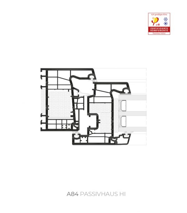 Sistema abisagrado de 84 mm de profundidad y 6 cámaras que ofrece las mejores prestaciones térmicas del mercado, con un valor de transmitancia Uf desde tan solo 0,76 W/m²K. Esta serie ha sido certificada por el Passivhaus Institute para la categoría cool-temperate (climas fríos y templados), convirtiéndose en una solución ideal para edificaciones de bajo consumo energético. Incorpora espumas aislantes especiales en marco y hoja, prescindiendo del refuerzo de acero para mejorar la transmitancia. Los vidrios asumen la función estructural de la ventana, fijándose al perfil mediante una cinta adhesiva especial.