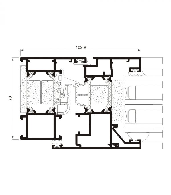 Sistema abisagrado de 70 mm de profundidad de marco compatible con cualquier herraje de canal 16 estándar. Presenta una rotura de puente térmico de 35 mm en marco y 30 mm en hoja, ofreciendo un gran rendimiento térmico y acústico.