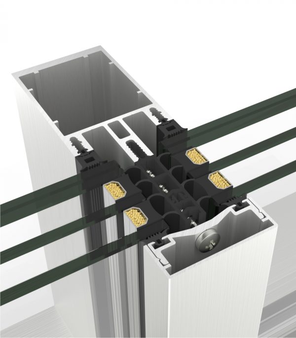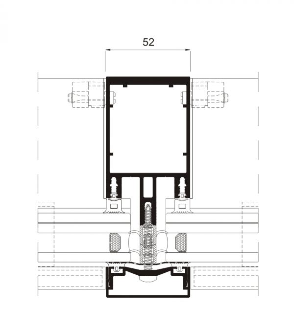 Sistema de fachada ligera formada por montantes y travesaños de 52 mm que componen la estructura portante. El vidrio se fija por los cuatro lados mediante un perfil presor continuo atornillado desde el exterior a los portatornillos incorporados en montantes y travesaños, ocultándose todo el sistema de fijación bajo un perfil embellecedor o tapeta de 52 mm de sección vista.