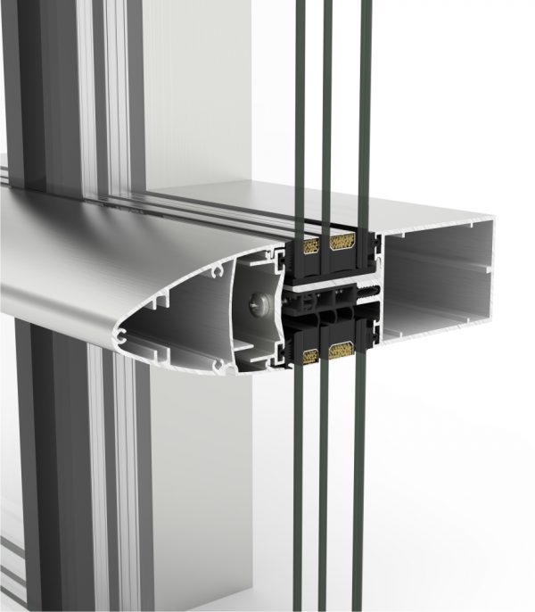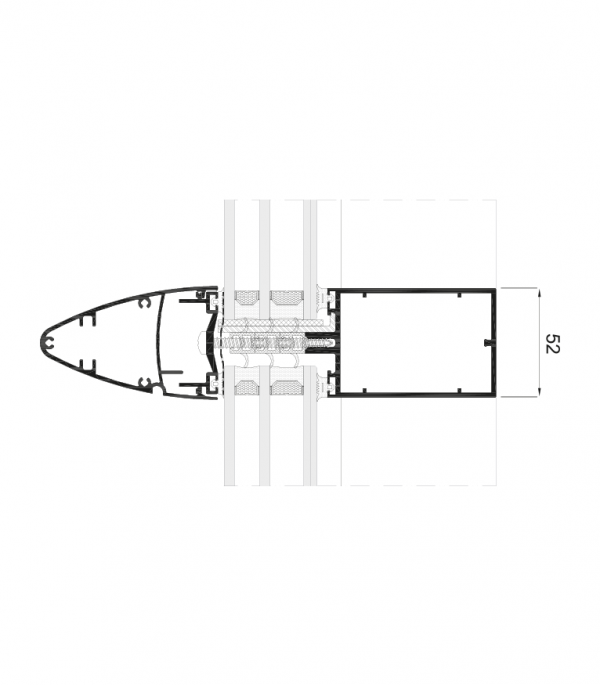 Solución de fachada en la que se combinan los sistemas TP 52 y SG 52. El vidrio se fija en las juntas horizontales mediante el binomio presor-tapeta, resaltando la trama en este sentido, mientras que en las aristas verticales se opta por la integración de las grapas y el perfil U.