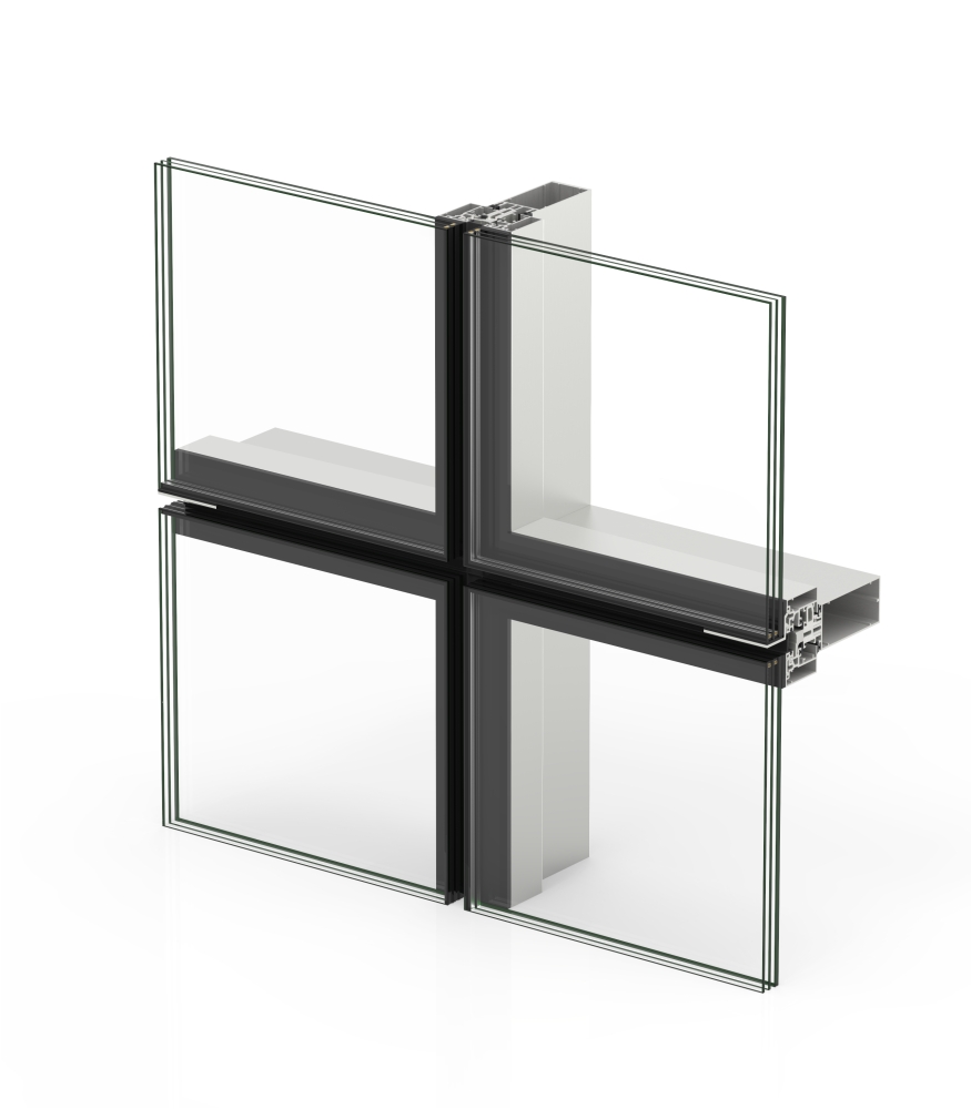 Solución de fachada en la que se combinan los sistemas TP 52 y SG 52. El vidrio se fija en las juntas horizontales mediante el binomio presor-tapeta, resaltando la trama en este sentido, mientras que en las aristas verticales se opta por la integración de las grapas y el perfil U.