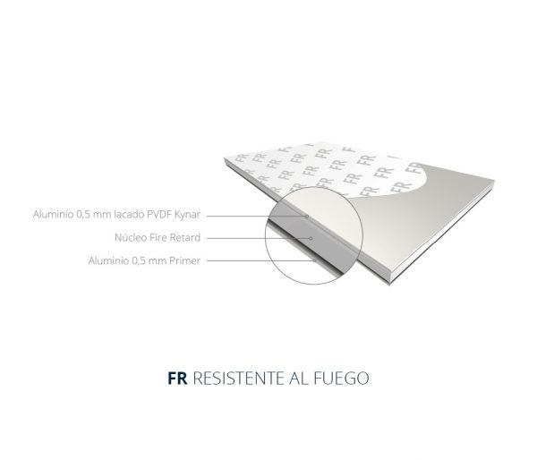 » El Panel FR con núcleo interior de resinas termoplásticas y partículas minerales de baja contribución al fuego con una clasificación B-S1,d0 según la norma UNE-EN-13501-1:2007. Es la solución ideal de cerramiento gracias a su sencillo mantenimiento, excelentes cualidades arquitectónicas e inmejorable eficiencia energética.